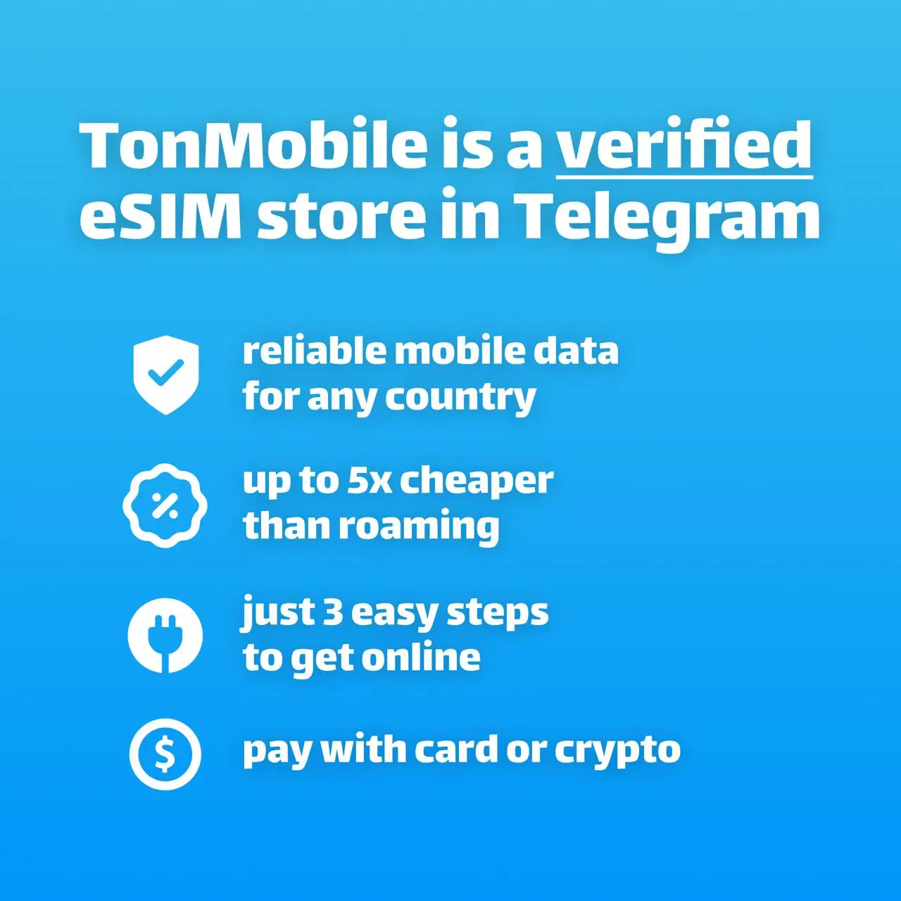 TonMobile eSIM lets you buy affordable mobile data for travel or home, paying with card, TON, or crypto—up to 5x cheaper than roaming