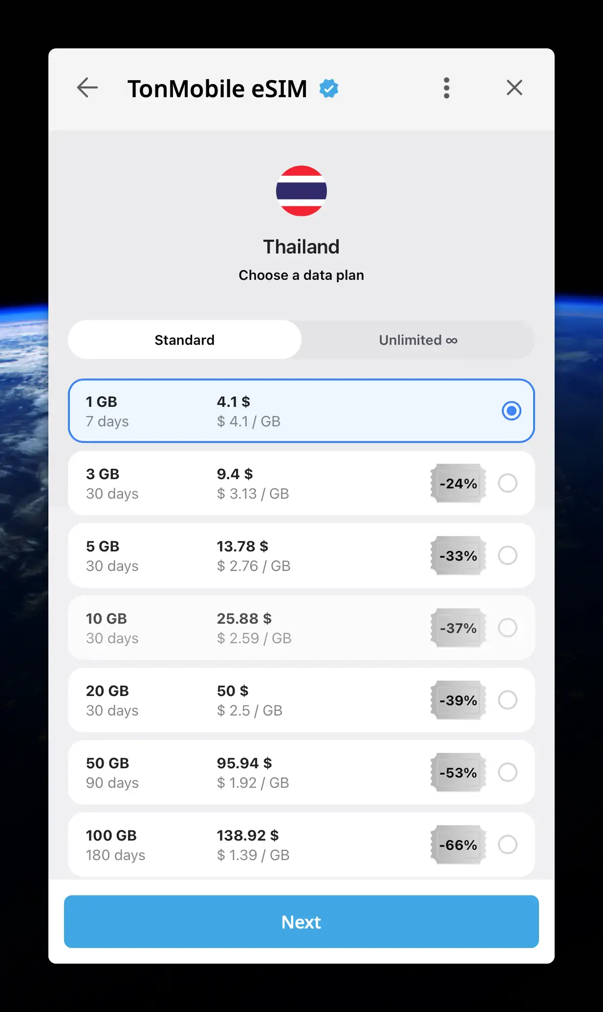 Open in TelegramTonMobile eSIM makes it simple to get mobile data anywhere in the world. Whether you're traveling internationally or need reliable internet at home, this bot lets you purchase eSIM plans and pay with traditional cards, TON cryptocurrency, or other crypto options.