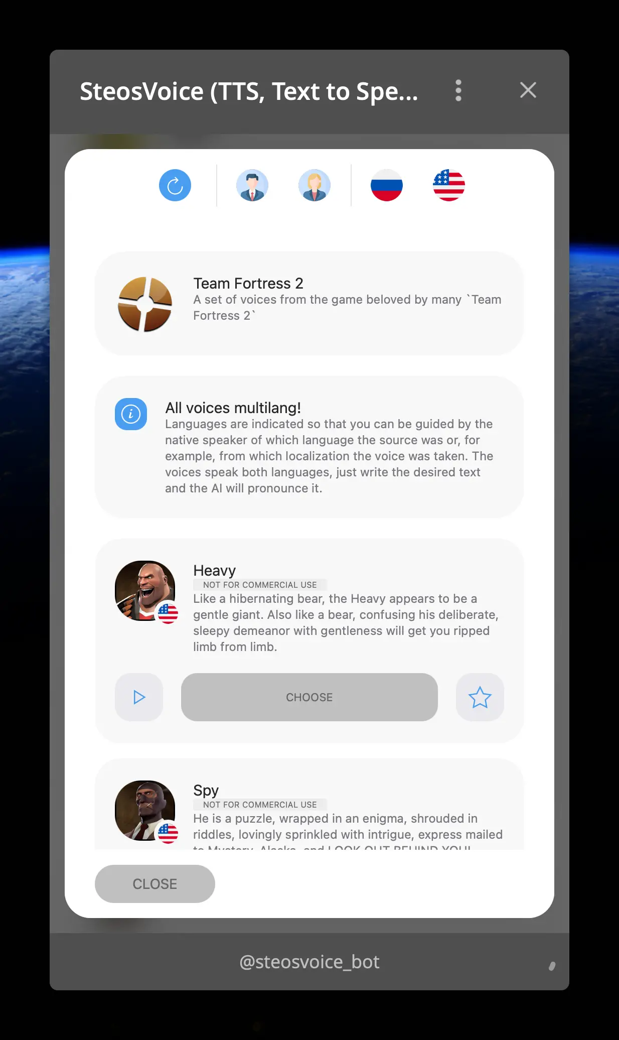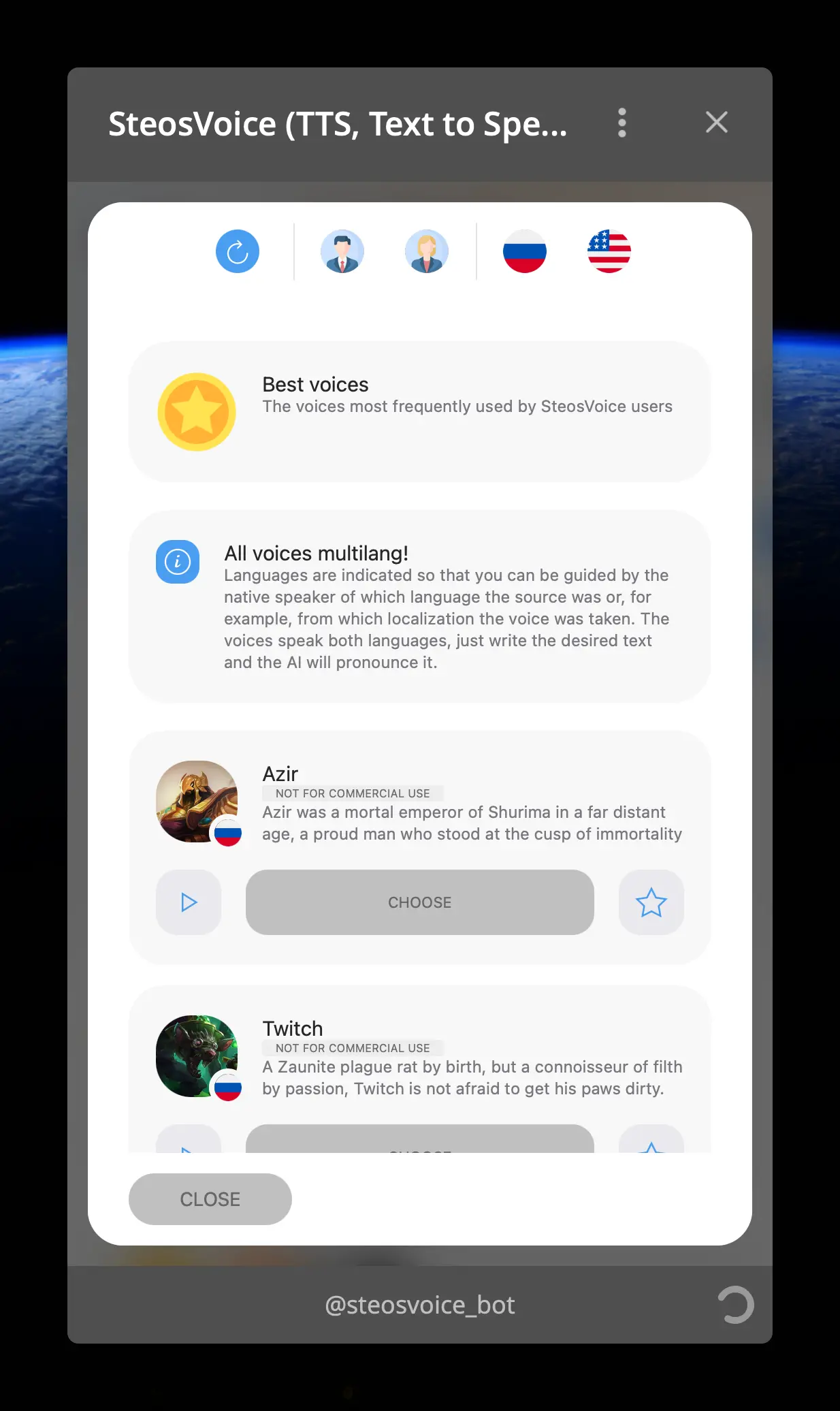 SteosVoice is a comprehensive voice technology bot that handles text-to-speech synthesis, voice message transcription, voice cloning, and AI music generation. The bot supports multiple voices and languages, making it a versatile tool for creating audio content directly in Telegram.