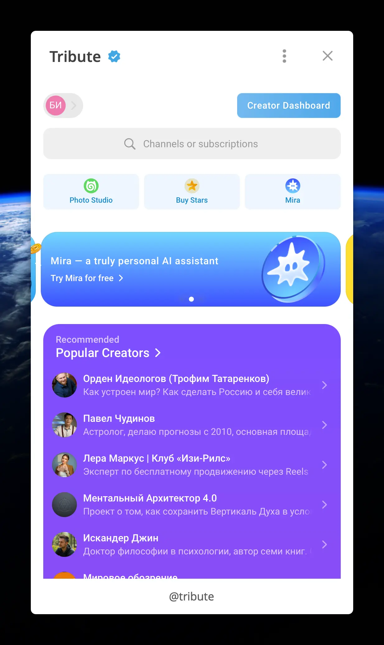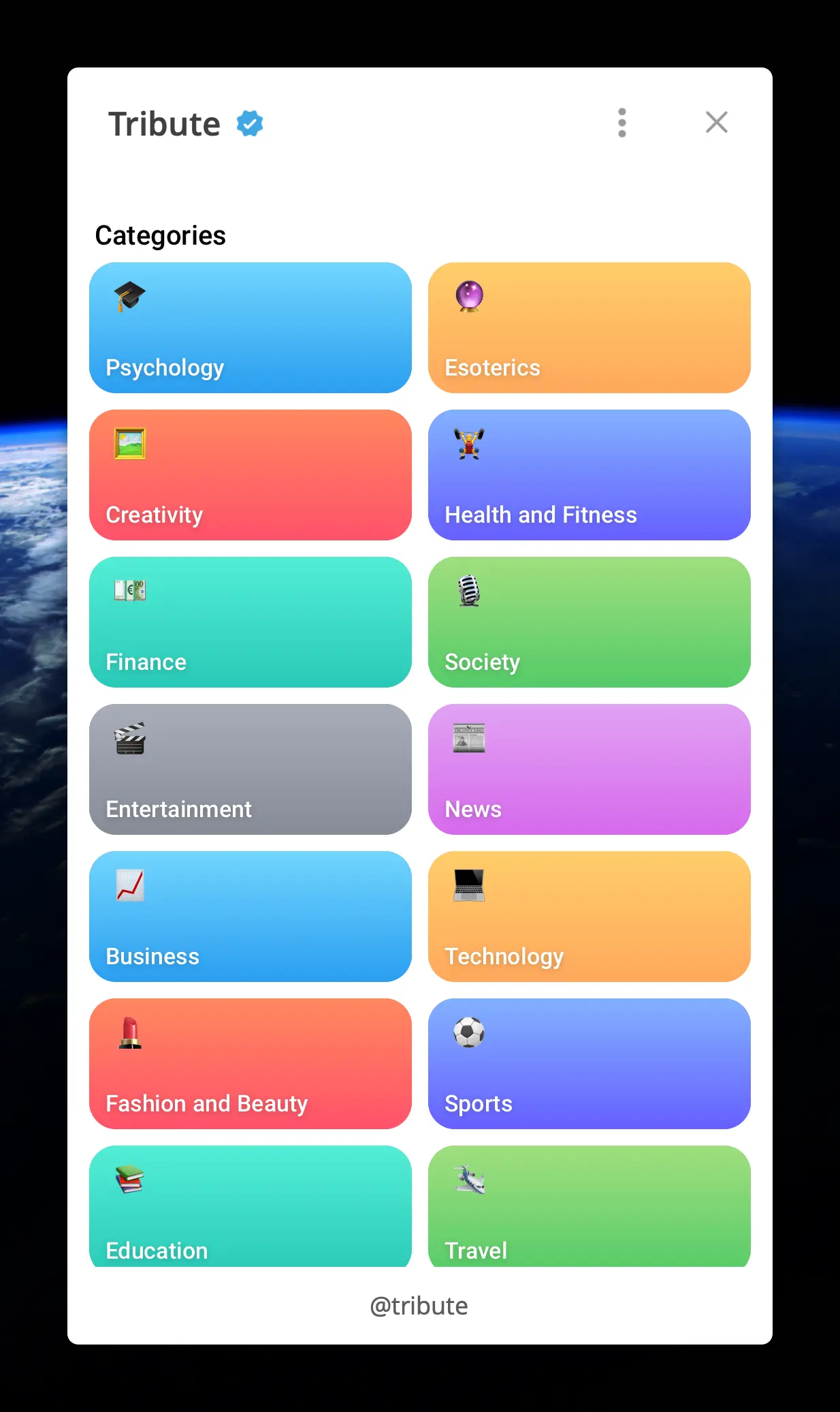 Open in TelegramTribute is a Telegram-verified bot that handles all aspects of content monetization while you focus on creating. Accept payments, manage subscribers, and sell your content directly through Telegram with complete security.